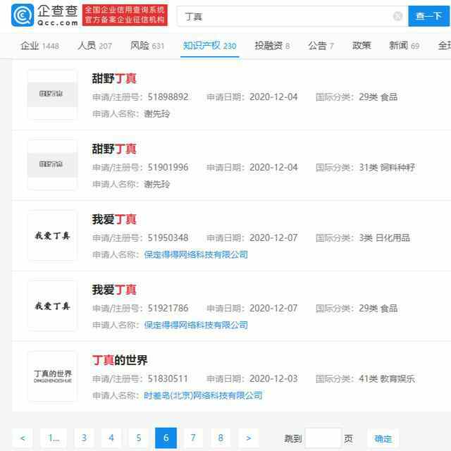 数据显示,截至12月13日,在中国商标网一共有122件涉及“丁真”的商标注册申请,除丁真所在的公司申请注册18件外,其它申请者均为与丁真无关的个人和公司,申请的商标包括甜野丁真、丁真小哥、丁真的世界、丁真的微笑、丁真旅游等。