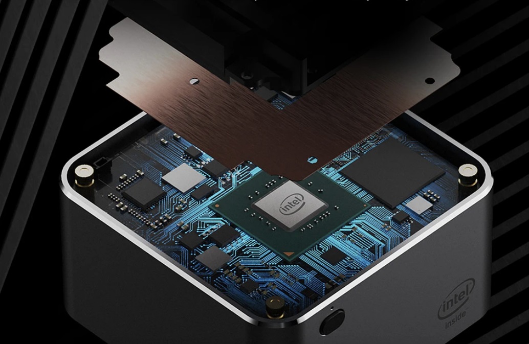 NucBox 采用高度集成的设计,内存以及固态硬盘均不可以更换。主板采用双层结构,CPU 位于最上层,与风冷散热器相接触。散热器采用静音风扇,噪声仅为 19db。