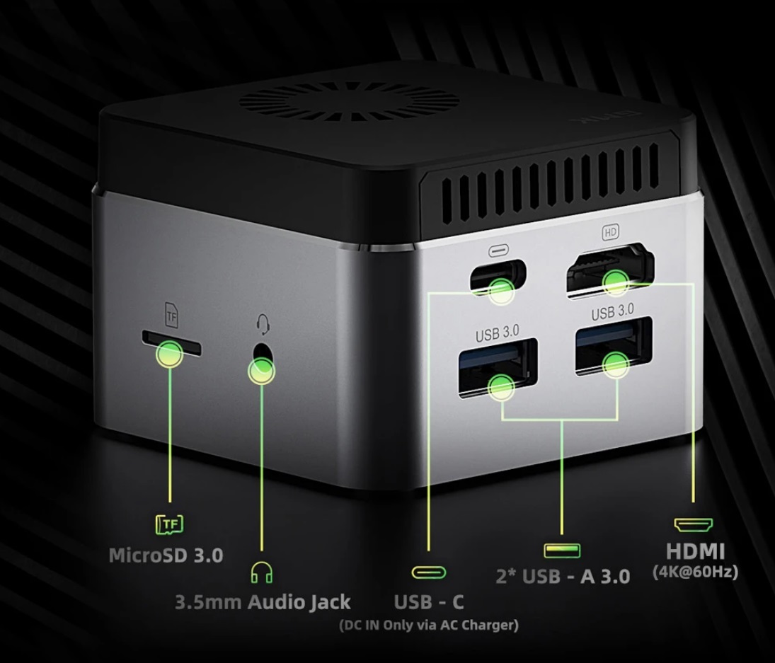 尽管这款电脑十分小巧,但是接口配置十分齐全。电脑配备两个 USB 3.0 接口,一个 Type-C 输入接口用于连接电源,一个 HDMI 2.0 接口以及 MicroSD 读卡器、3.5mm 音频输出口。