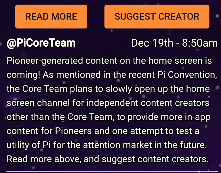 到目前为止,只有核心团队使用 Pi 应用主屏幕来发布公告和组织社区活动。但核心团队计划慢慢打开主屏幕频道,让更多内容创作者(核心团队本身)来广播其内容。这意味着,从现在起,主屏幕上的内容不会总是来自核心团队。此类内容的制作独立于核心团队。先锋或影响者提供的观点和信息是他们自己的,并不代表核心团队的观点或决定。我们将尽量明确地标记非核心团队内容,但请注意谁创建每个帖子。