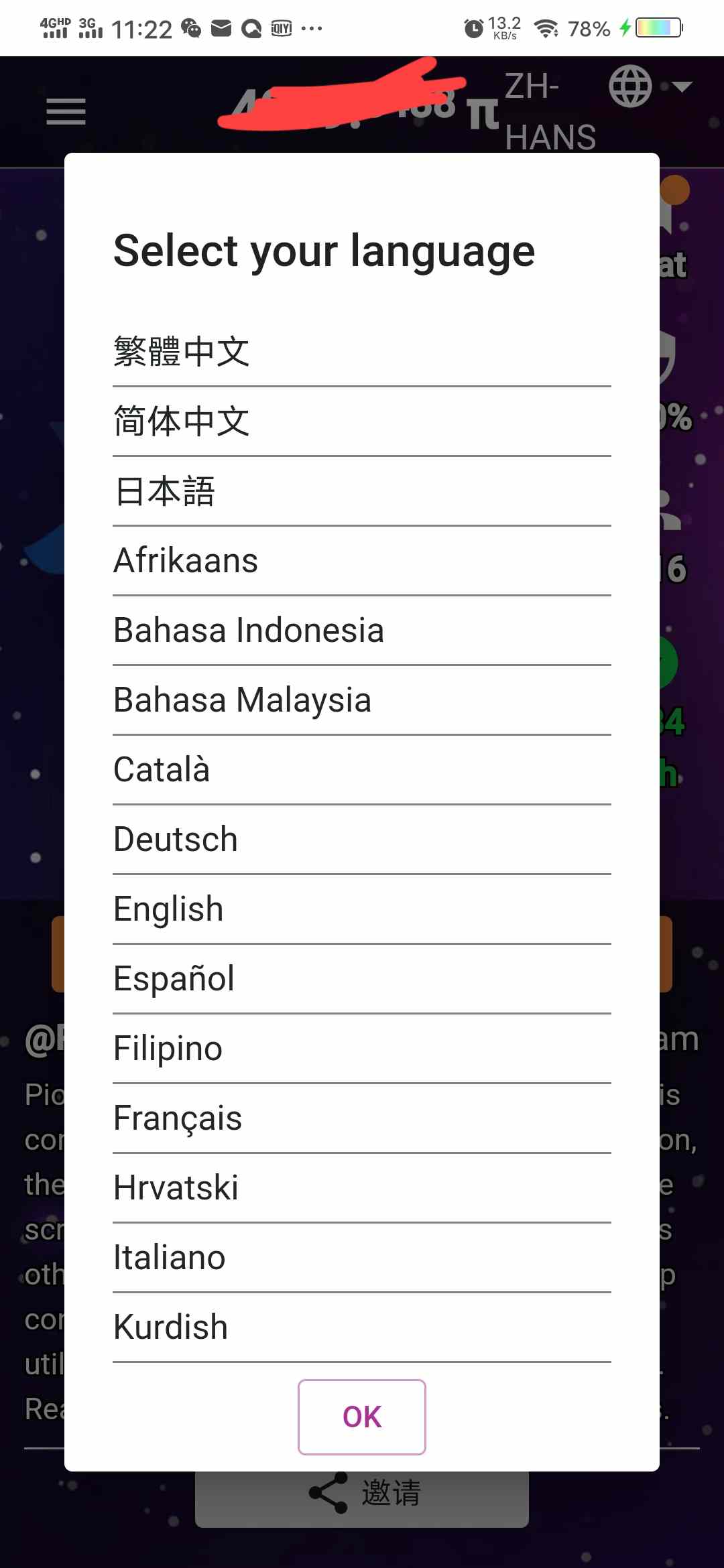 第一:派的主页右上角出现可以更换不同国际的翻译文体,一共有34个国家之多!更为骄傲的是光我们中国的就占了两个,一个简体中文,一个繁体中文!在这里面是绝无仅有的现象,也足以见得项目方对我们中国区派友的重视。
