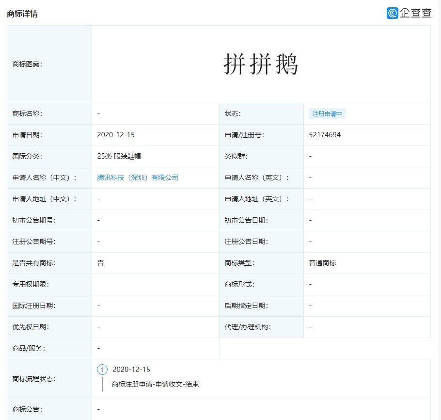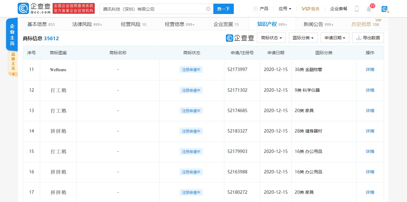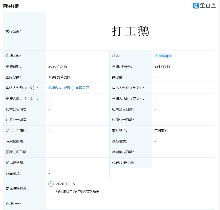 12月21日消息 企查查 App 显示,腾讯科技(深圳)有限公司于近日新增 “打工鹅”、“拼拼鹅”等商标信息,商标涉及的国际分类包含家具、办公用品、广告销售、科学仪器等,目前商标状态为 “注册申请中”。