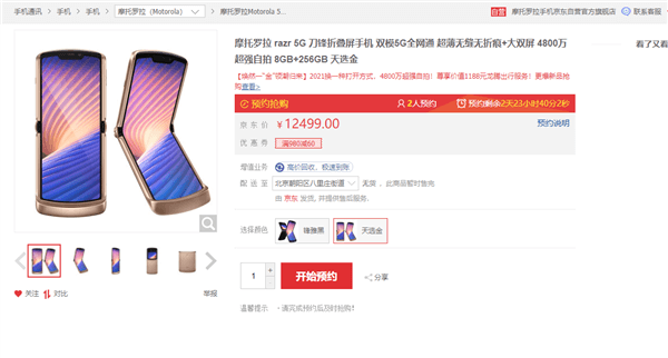 12月22日消息,摩托罗拉刀锋5G折叠屏手机天选金配色今天开启预约,售价12499元(8GB+256GB)。