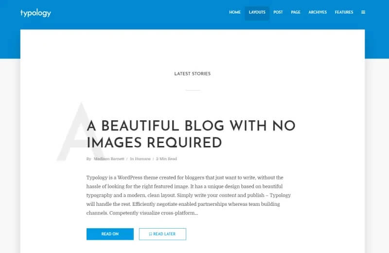 Typology 是一款以文字为基础的主题,这款主题最大的亮点就是它会自动提取标题的第一个文字做成背景样式,就算不不加任何的图片装饰也能做出很漂亮的网站,而且Typology 采用单栏布局、时间轴列表等,非常适合用来写博客