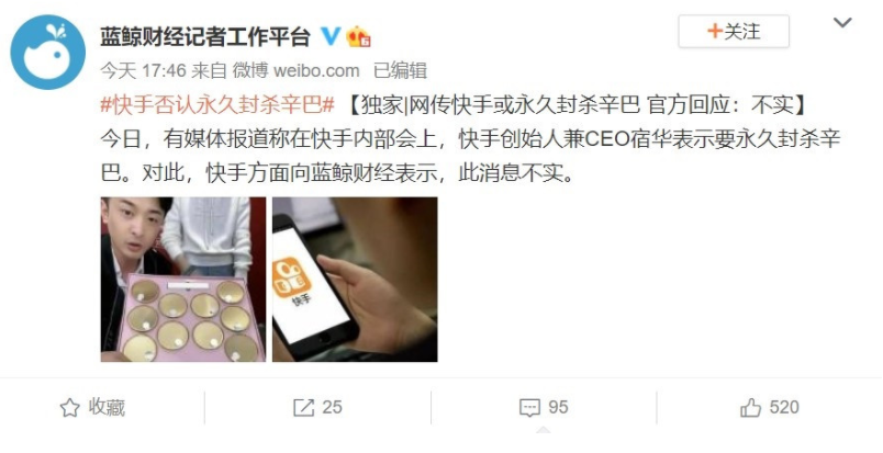 有媒体报道称在快手内部会上,快手创始人兼 CEO 宿华表示要永久封杀辛巴(原名辛有志)。现据蓝鲸财经报道,对此,快手方面表示,此消息不实。