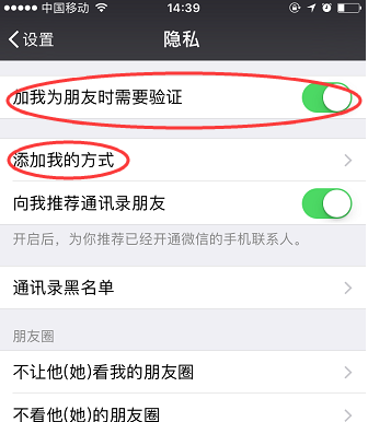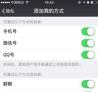 最后进入“添加我的方式页面”,不需要拿个添加方式就关闭哪个选项的功能,这样陌生人就不能随便的加为好友了,也就避免被陌生人拉进微信群聊天了,小编的是全部都打开的(苹果手机)。