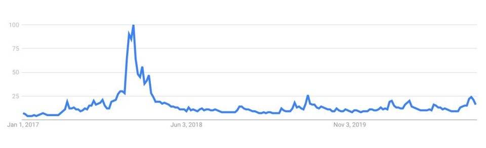 2020 年 11 月,比特币搜索量达到阶段性峰值,但仍仅相当于历史最高点的四分之一,图片来源:谷歌