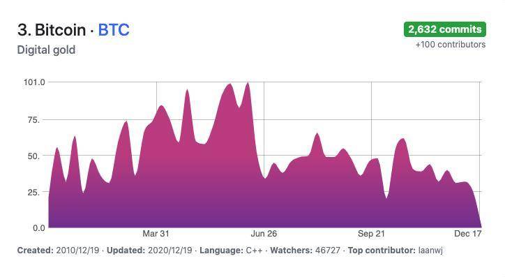 比特币 Github repo 的活跃度目前在整个加密货币领域排名第三,图片来源:Cryptomiso
