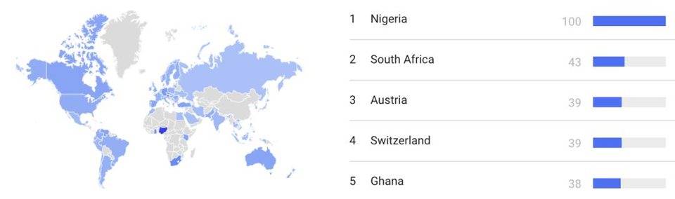 尼日利亚、南非、澳大利亚、瑞士以及加纳是今年比特币搜索量排名前五的国家。