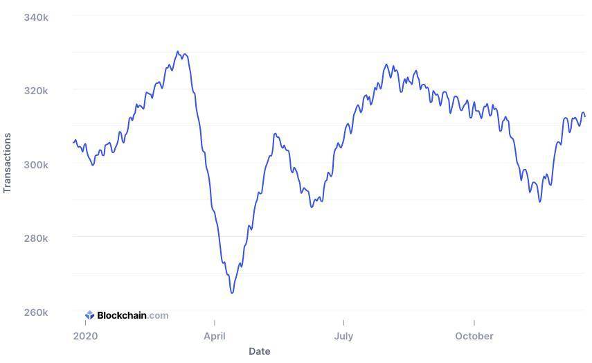 比特币在整个 2020 年呈现出巨大的交易量波动,图片来源:Blockchain.com