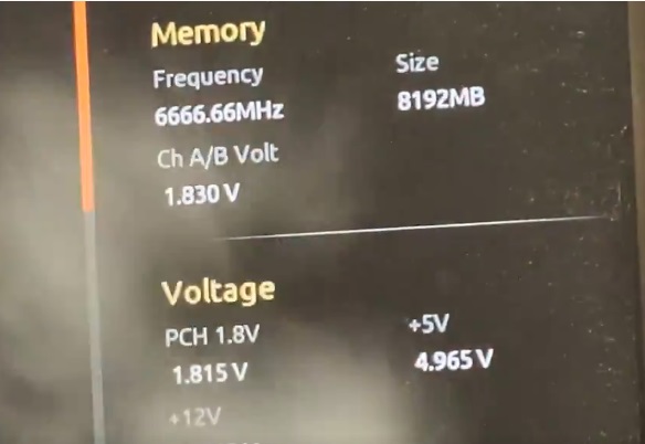 不仅如此,视频中还展现了内存超频的画面。这个平台搭载单条 8GB DDR4 内存,视频作者将内存超频至 6666.66MHz,内存电压为 1.830V。