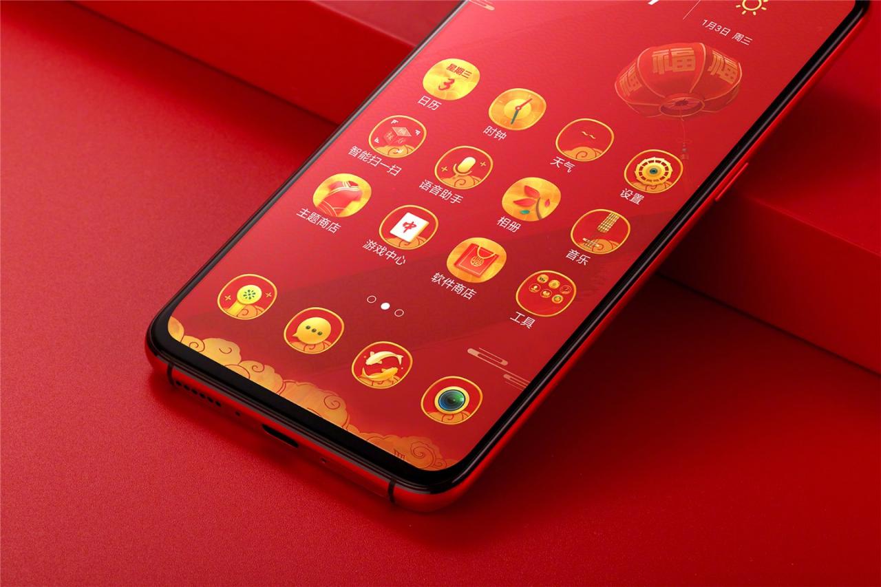 OPPO 的新年特别款在外观上多以大红色为主,点缀着烫金 LOGO,整体看上去非常喜庆,除此之外,早年间的 R 系列还会特别定制新年版的主题 UI。