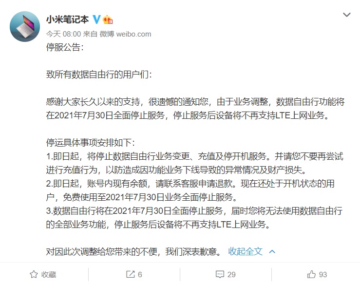 小米笔记本官微发布公告,表示由于业务调整,数据自由行功能将在 2021 年 7 月 30 日全面停止服务,停止服务后设备将不再支持 LTE 上网业务。