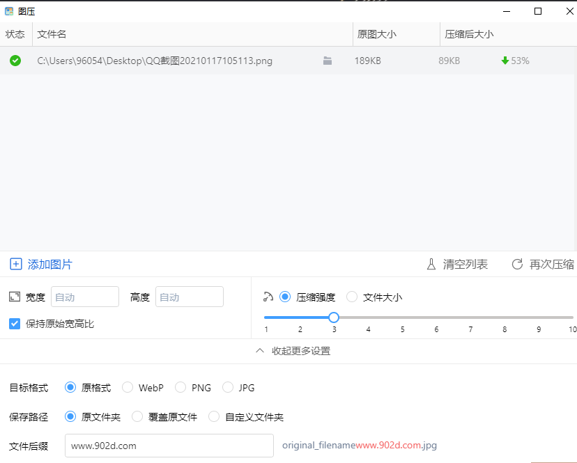 图压的核心功能非常简单,它可以帮助你减小图片的体积,并压缩至指定大小,只要将想要压缩的图片拖入软件窗口即可,压缩后的图片会出现在原路径,另外还提供了指定目标格式、保存路经、文件后缀等选项。