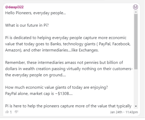 Pi is dedicated to helping everyday people capture more economic value that today goes to Banks, technology giants ( PayPal, Facebook, Amazon), and other intermediaries….like Exchanges.