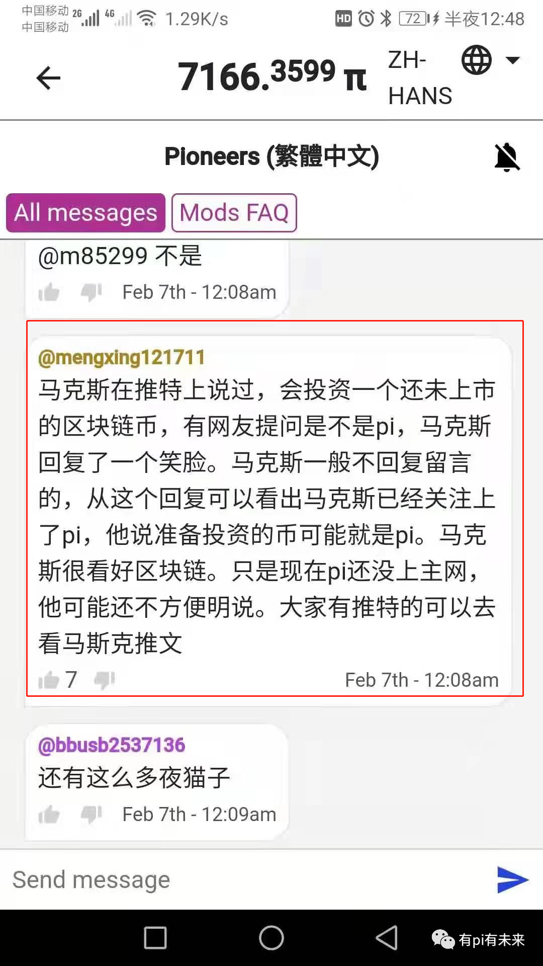 这是π友在聊天室里面爆料,爆料很简单几行字,错字一大堆,跟我有的一拼,原因是太激动了。激动的竟然把马斯克写成马克斯,如果马克斯看到之后肯定会给他一个大嘴巴子并且还会不屑的说pi币是个什么屁玩意?电灯泡才是这个社会最伟大的发明,就开始滔滔不绝的讲起电灯泡的故事。π友爆料马斯克会投资一个还未上市的区块链项目,当然这种未上市的区块链项目多如牛毛,但是π币给了π友超出常人的自信问马斯克是否是π币,而得到马斯克一个笑脸的回复。这个笑脸是很有含义的,比如说你跟陌生人微信好友聊天,好友问你今年是不是赚了一千万?如果你在一千万左右以及以上谦虚的人就会回复一个笑脸不回答。如果你没有赚到一千万那你肯定会说哪有那么多才900万。所以马斯克这个笑脸是非常有含义的没有肯定也没有否定,所以马斯克将来要投资π币的可能性是非常大的,当然前提条件是π币真的能够成功。