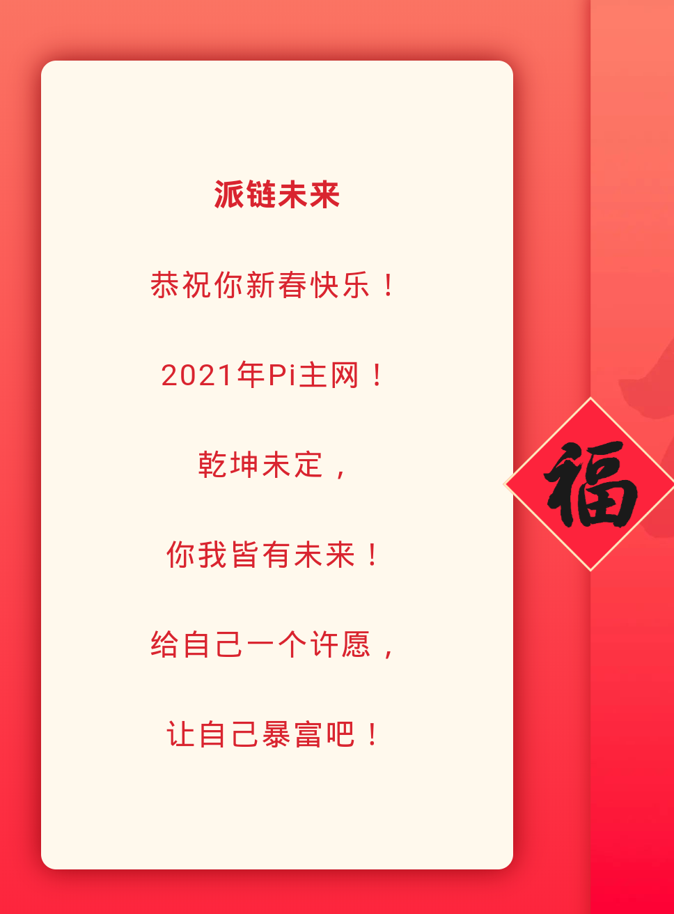 最后,新年将至,送你一份祝福!请派友们开心接收,我们的目标是一致的,将Pi影响力扩大,商业价值提升,你我皆收益!加油!