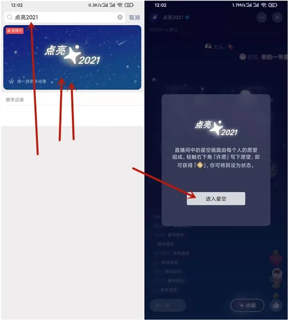 在微信上搜索 “点亮2021” 点击横幅进入活动直播间,在直播间右下角选择 “许愿”,再点击 “进入星空”