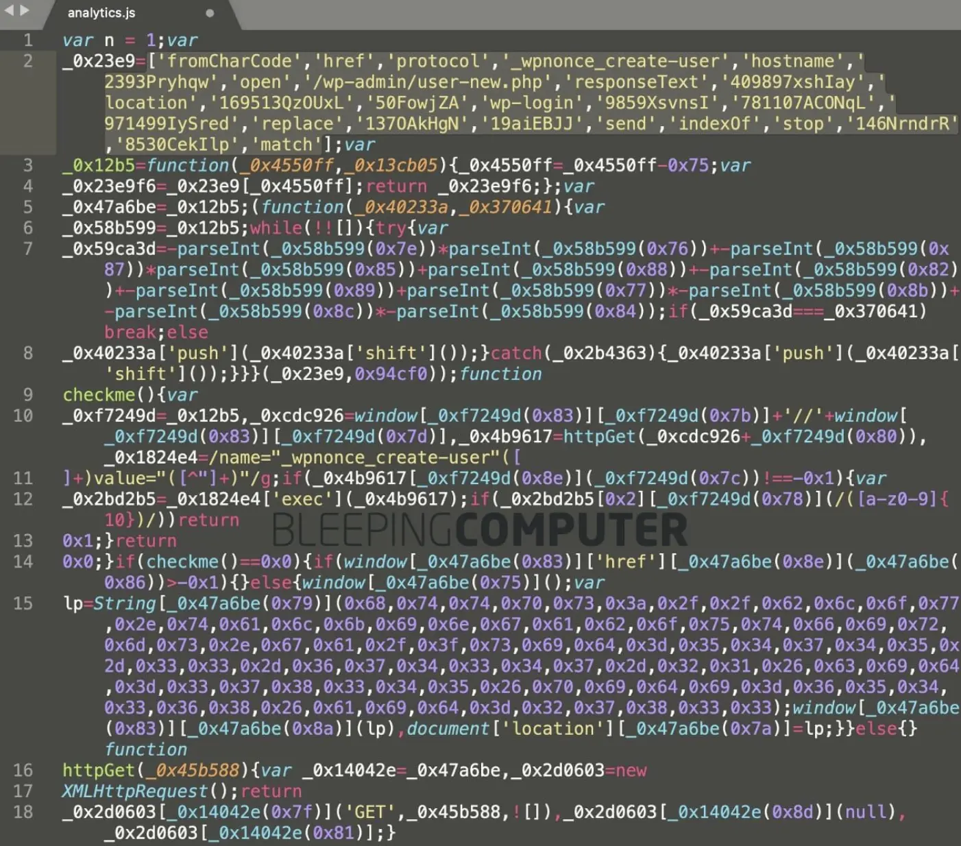 这两个名为 jquery-migrate.js 和 jquery-migrate.min.js 的文件具有混淆代码,在代码中它们会进一步加载了一个神秘的 analytics.js 文件,这个文件里面也包含恶意代码。目前这次攻击产生的影响规模范围尚未确定。