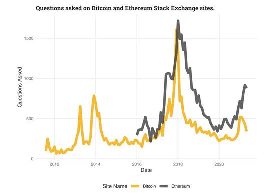 调查指出,在 Stack Exchange 网站上围绕标签和问题收集的数据中;虽然比特币最先出现,但自 2016 年以来,以太坊相关的问题已经变得更加普遍。在去年,平台用户对以太坊的兴趣就一直高于对比特币的兴趣。