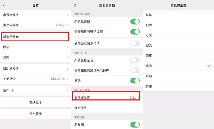 而最牛的更新就是— 支持自主更换新消息提示音和微信通话的来电铃声