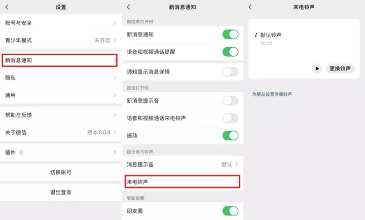 设置方法:打开微信设置 → 新消息通知 → 来电铃声