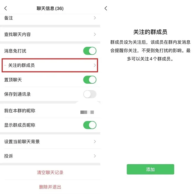 设置方法:微信群聊 → 关注的群成员