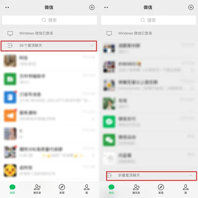 面对很多重要的好友和群,都会选择置顶,不过置顶太多后接受新消息就需要翻到第二屏,这时候置顶折叠就显得格外重要