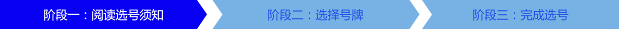 一:系统将提供"50"选1的选号方式,"50"个号牌号码在显示屏上分多屏显示; 二:进入选号阶段时,请先点击"开始选号"按钮,并在"180"秒内完成选号; 三:未在规定时间内完成选号的,将按照以下方法确定机动车号牌: 1)您未选取任何一个号牌号码,系统将自动确定号牌列表的第一个为最终选定号牌号码; 2)您选取了其中一个号牌号码,但未进行确认的,系统以您选取的结果为最终选定的号牌号码。